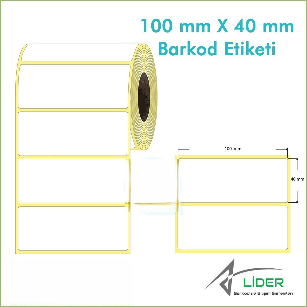 En : 100 mm Boy: 40 mm ölçüsünde tek sıra rulo halinde termal etiket, barkod etiket, rulo etiket